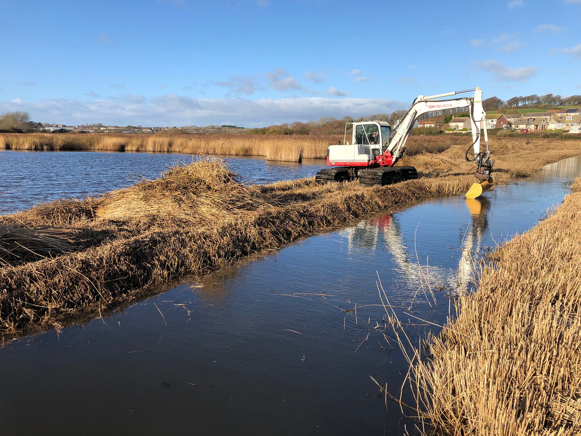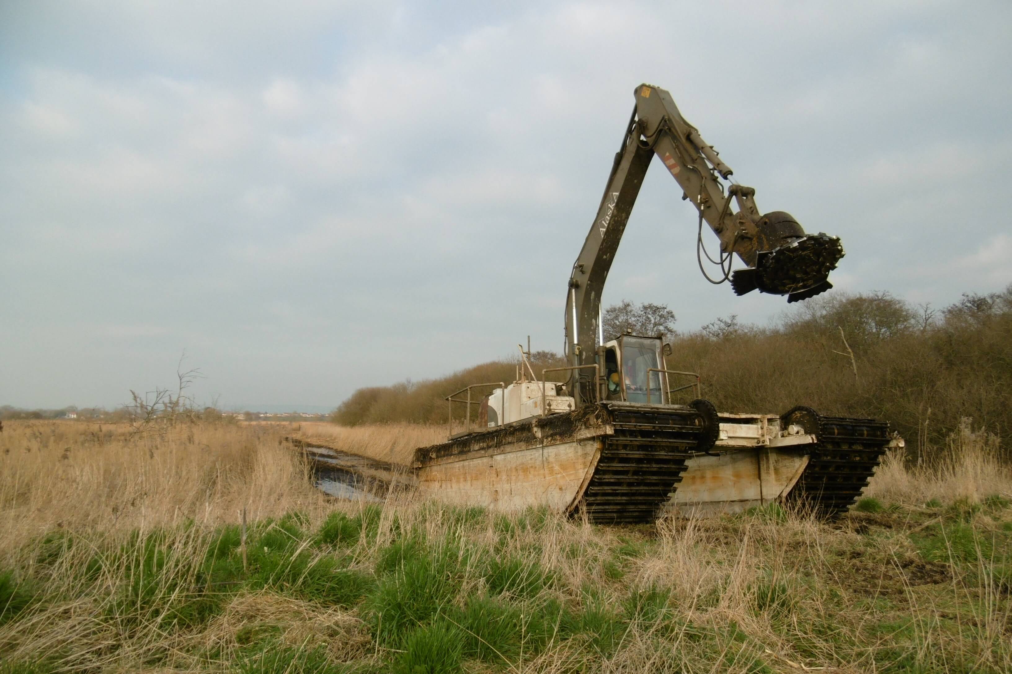 Ultra low ground pressure 7 tonne excavator on a longer and wider undercarriage designed to accommodate 1000mm (1 metre) wide track pads. Photo: Reedbed and ditch management, RSPB Lodmoor, Weymouth Wetland Reserve.