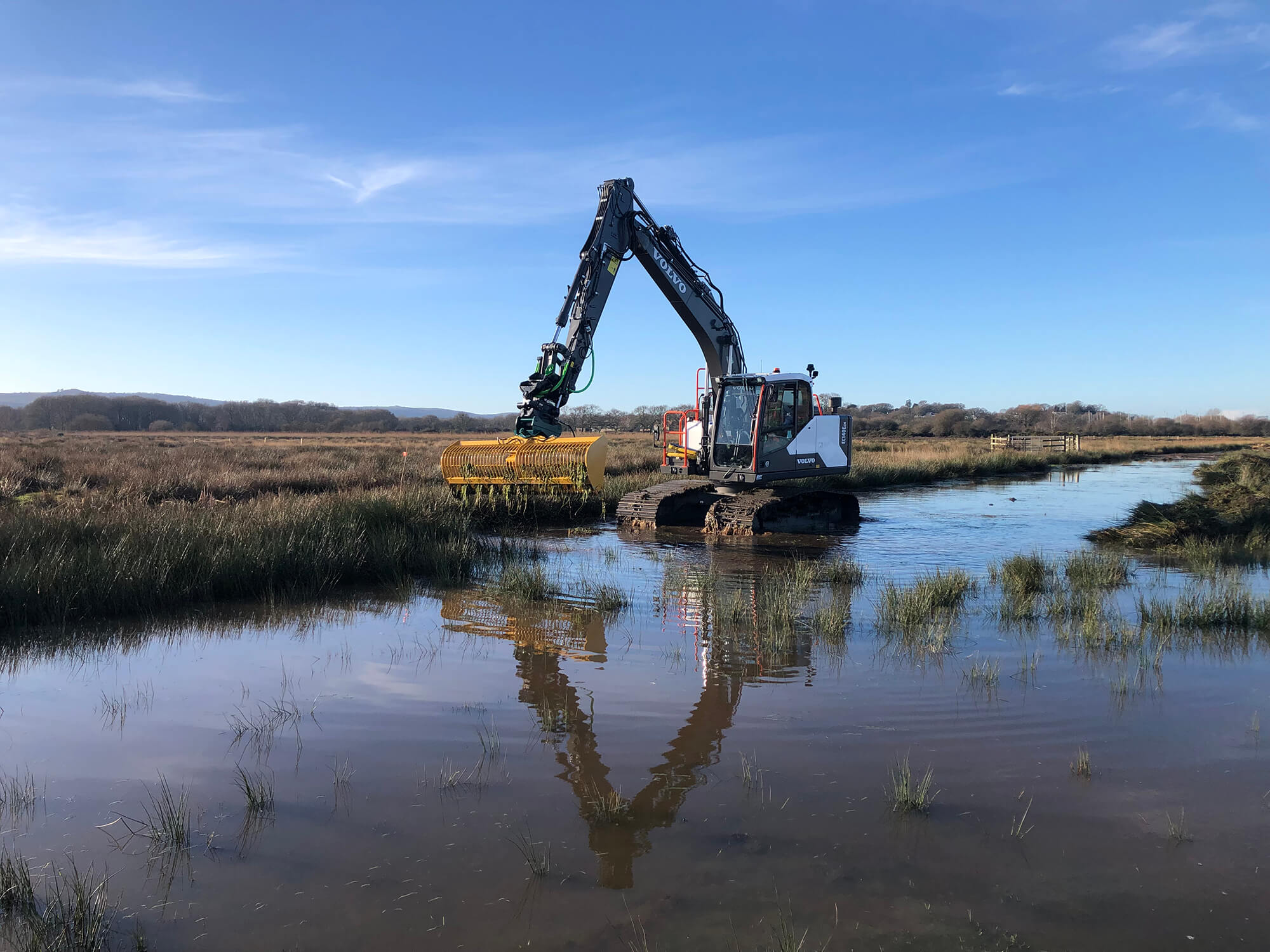 Forestry spec 14 tonne excavator with high-level track frame for extra ground clearance. Low ground pressure 900mm wide tracks. Can be used with various attachments, including a weed-cutting bucket. Photo: Ditch vegetation manangement, Arne Moors Coastal Change Project.