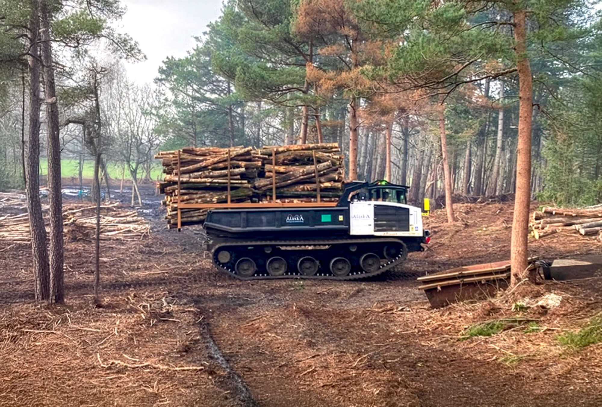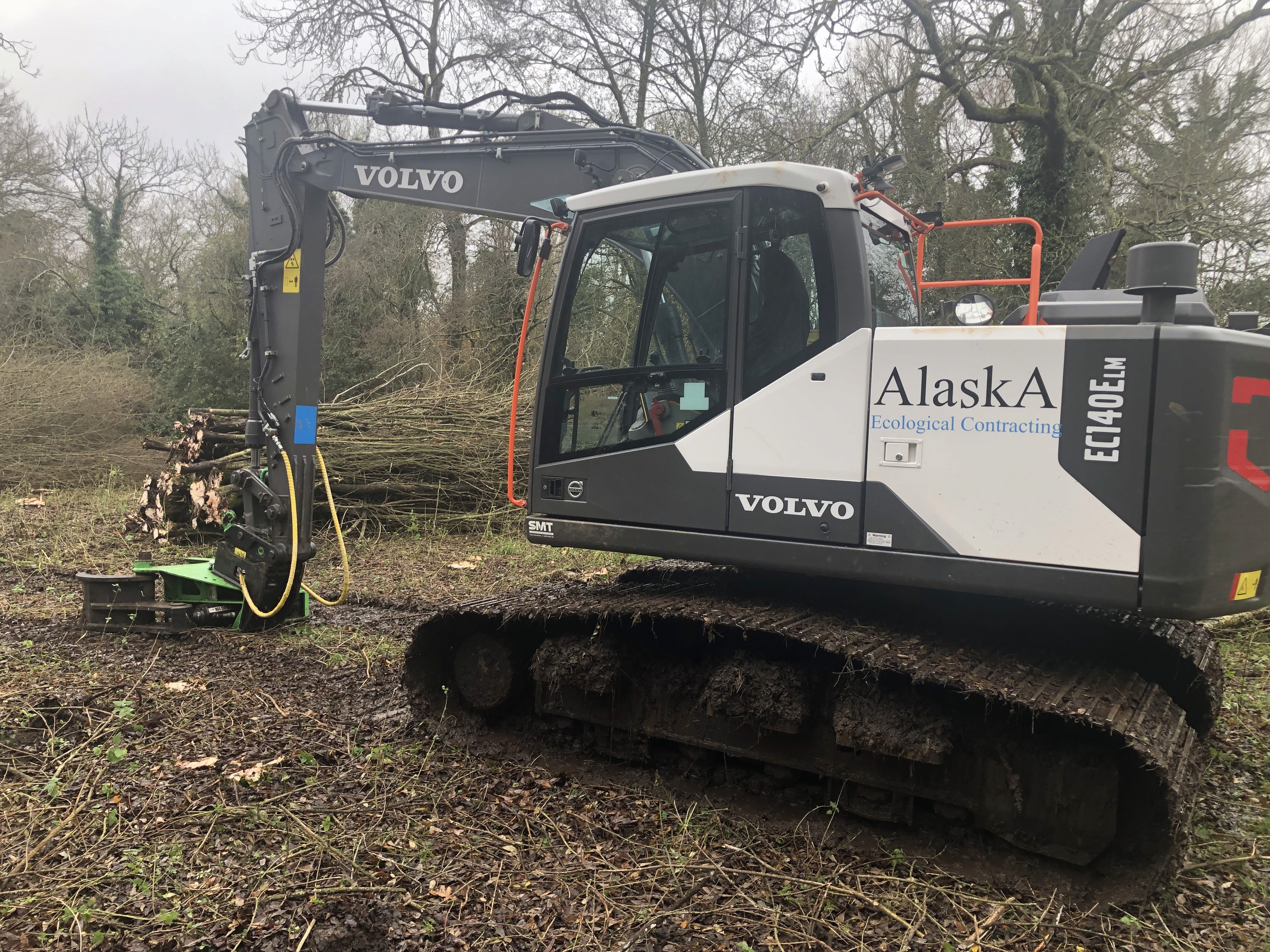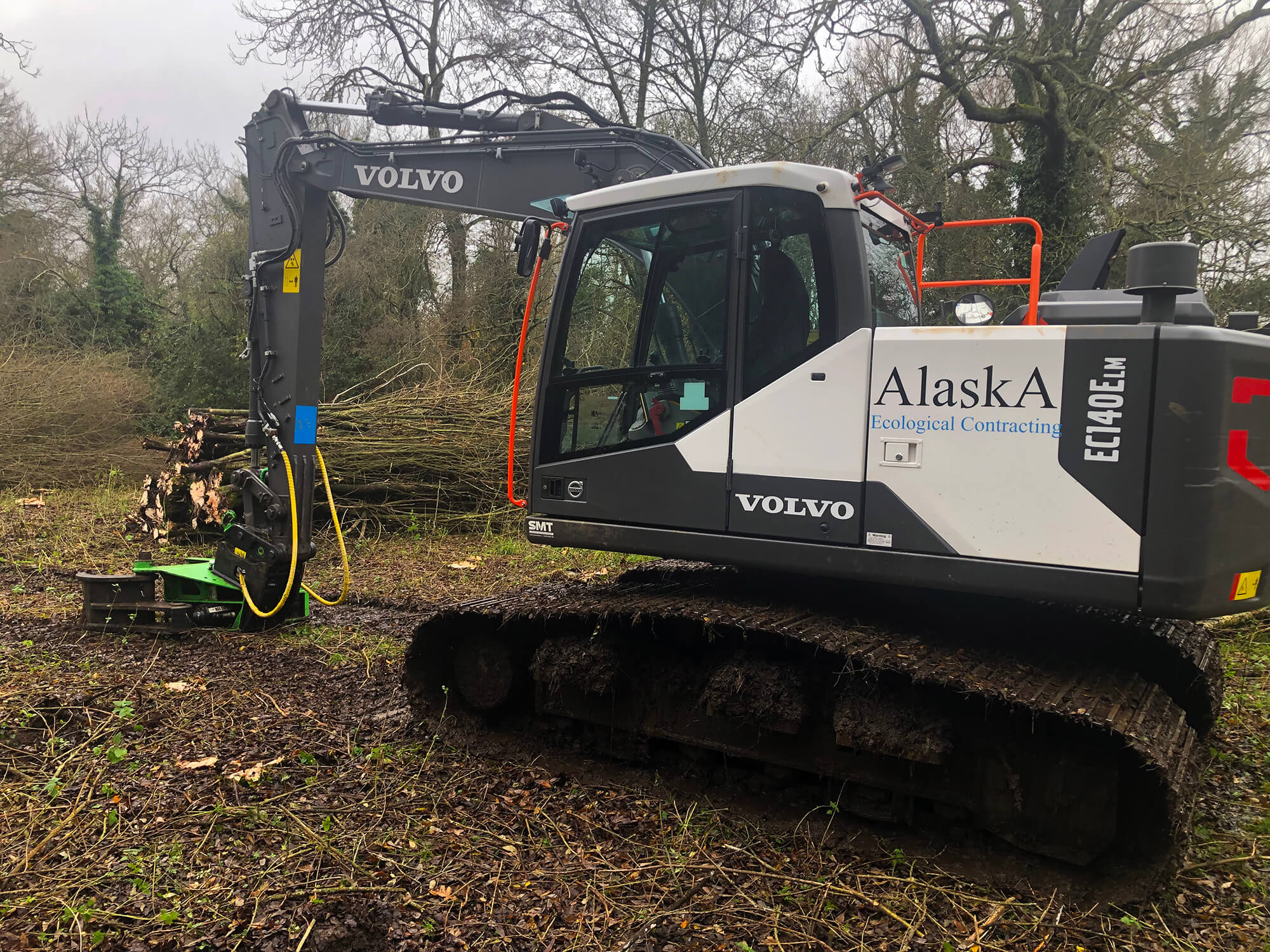 Tree shear can cut up to 400mm diameter hardwood and up to 450 diameter softwood. Trees and scrub can be cut flush with the ground level. Photo: Scrub Clearance at Greywell Moors. Hampshire & Isle of Wight Wildlife Trust.