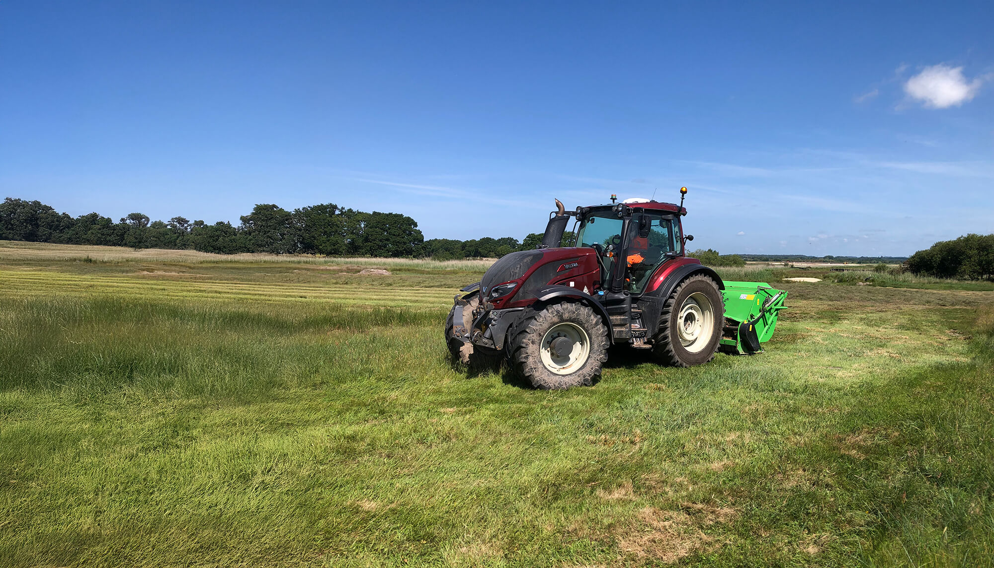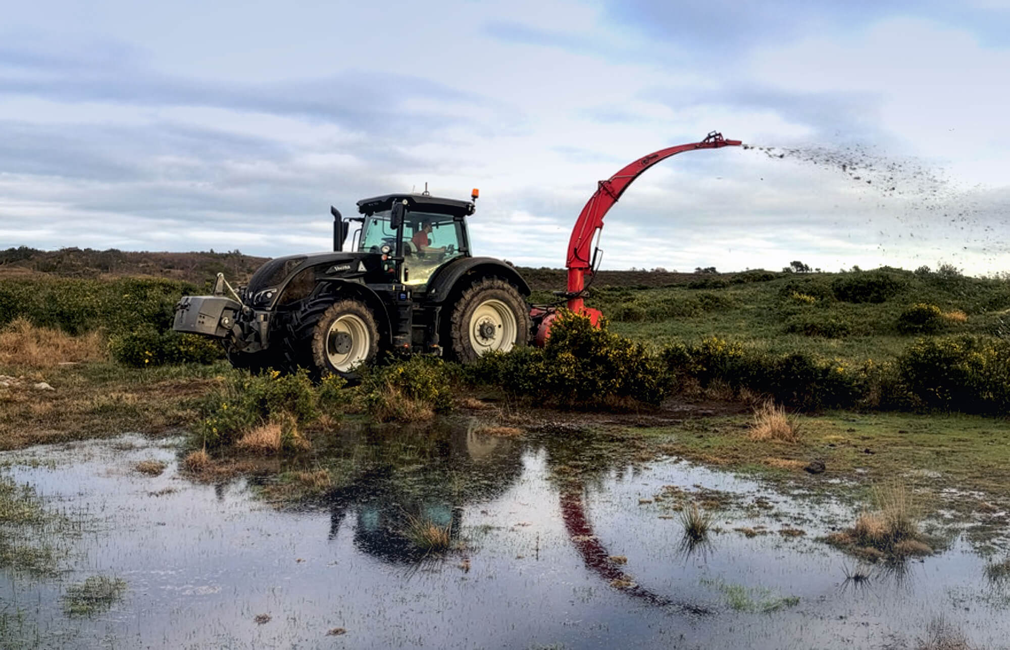 A 234HP Valtra tractor with Ryetec Flail Collector. Suitable for cut and collect of grassland, heathland and light scrub, can also be used to pick up previously flailed material from heavier scrub. Photo: Grassland Management, Arne Moors Coastal Change Project.