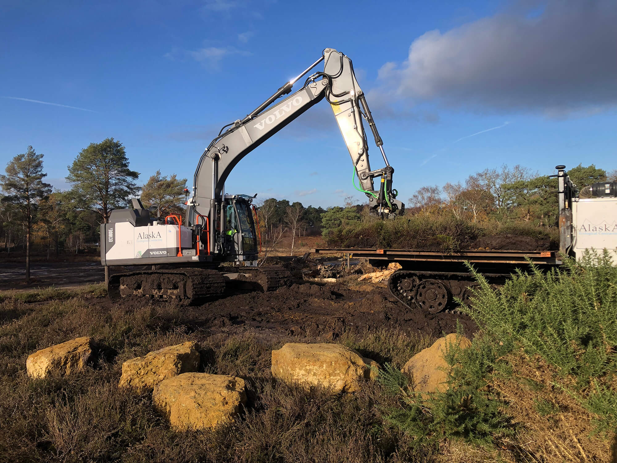 A mainstay of the AlaskA fleet of excavators, an excellent excavator for many tasks with a reach a reach of just over 9 metres. Photo: Placing translocated heathland turves on the Heathland Greenbridge, M25 J10 A3.