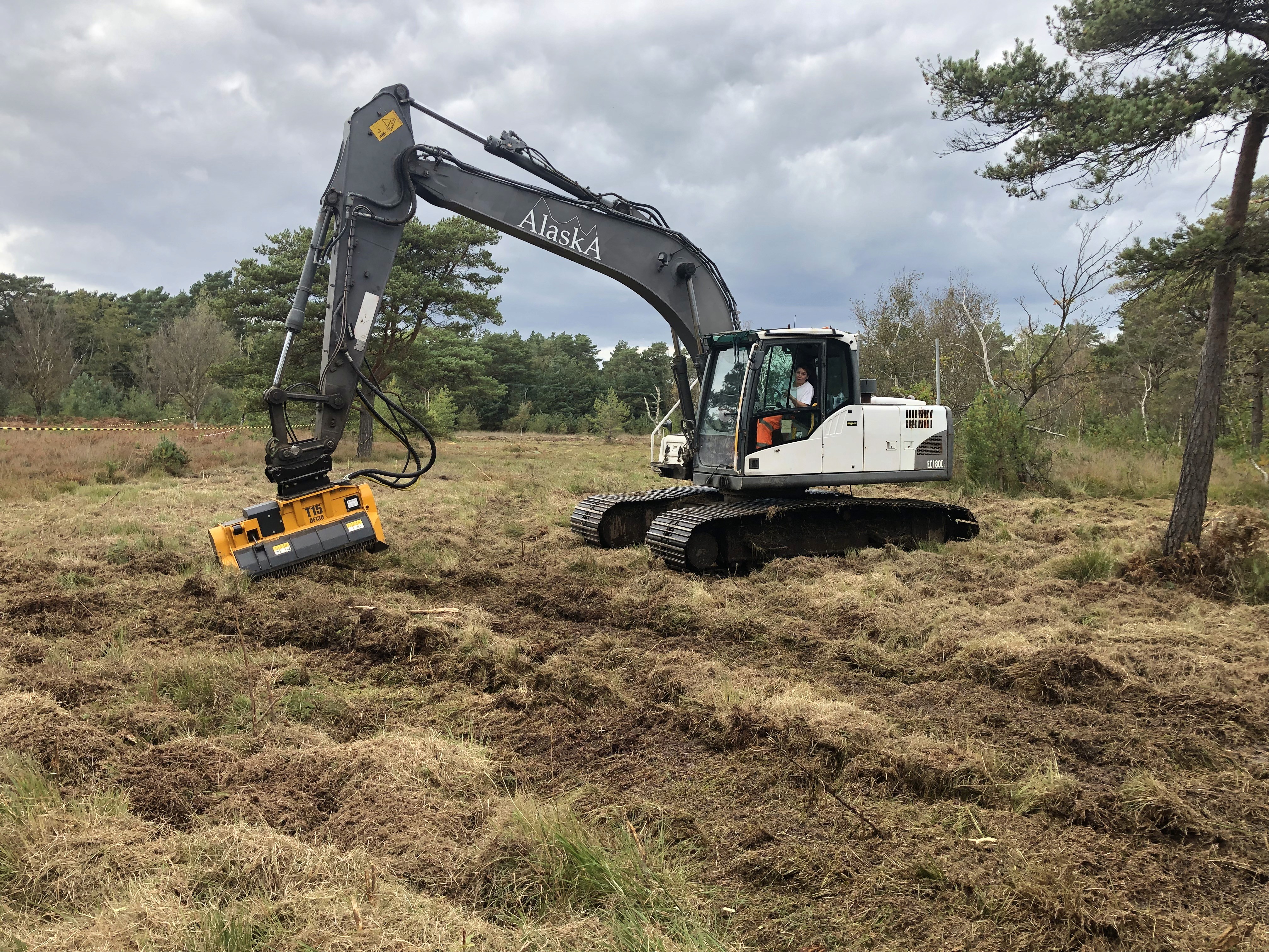 Excavator mounted flail mulcher with fixed hammers (pictured), also available is a swinging hammer option with a collection box. Photo: Dorset Peat Partnership, RSPB Salterns Copse, Arne Nature Reserve.